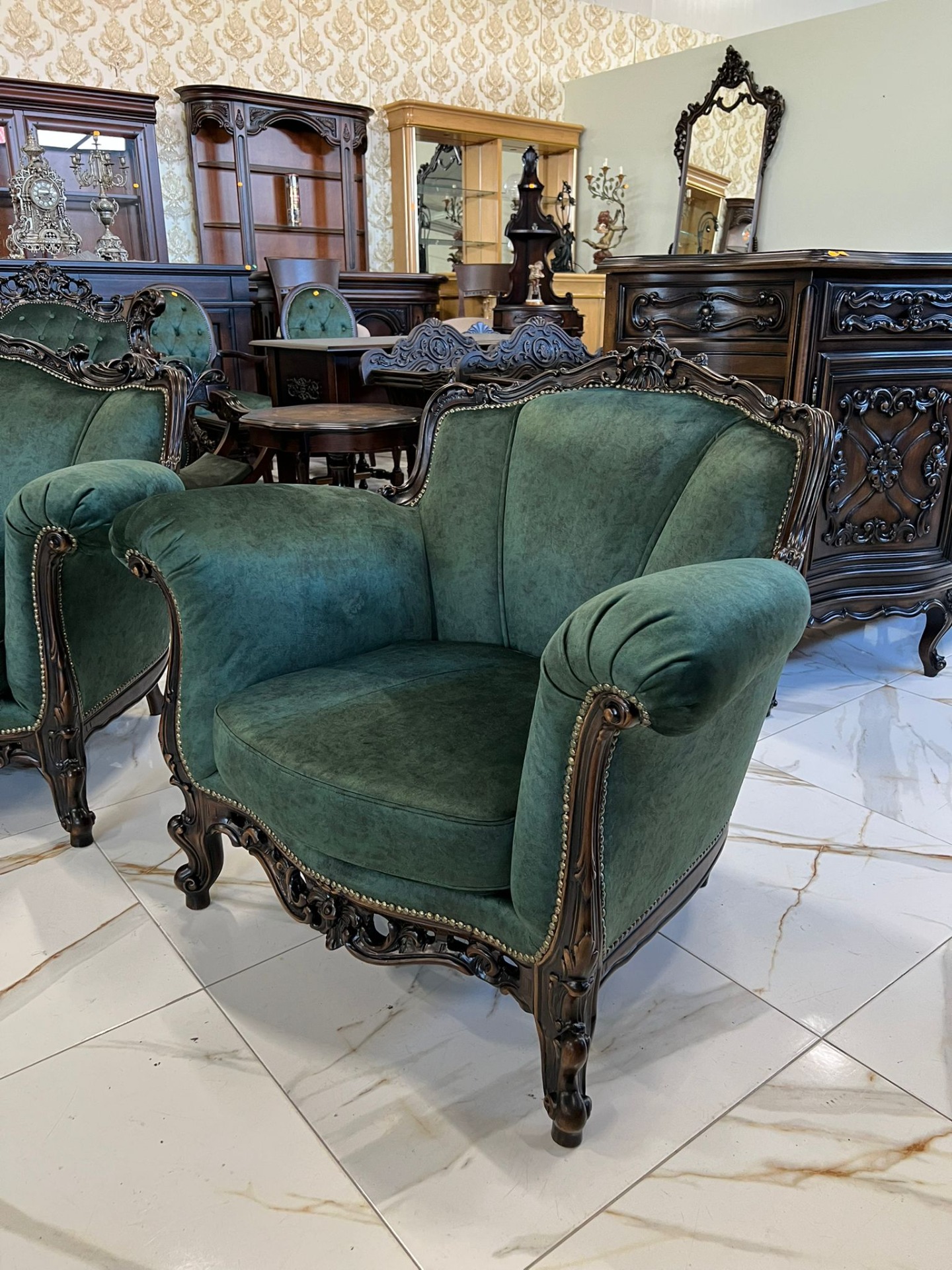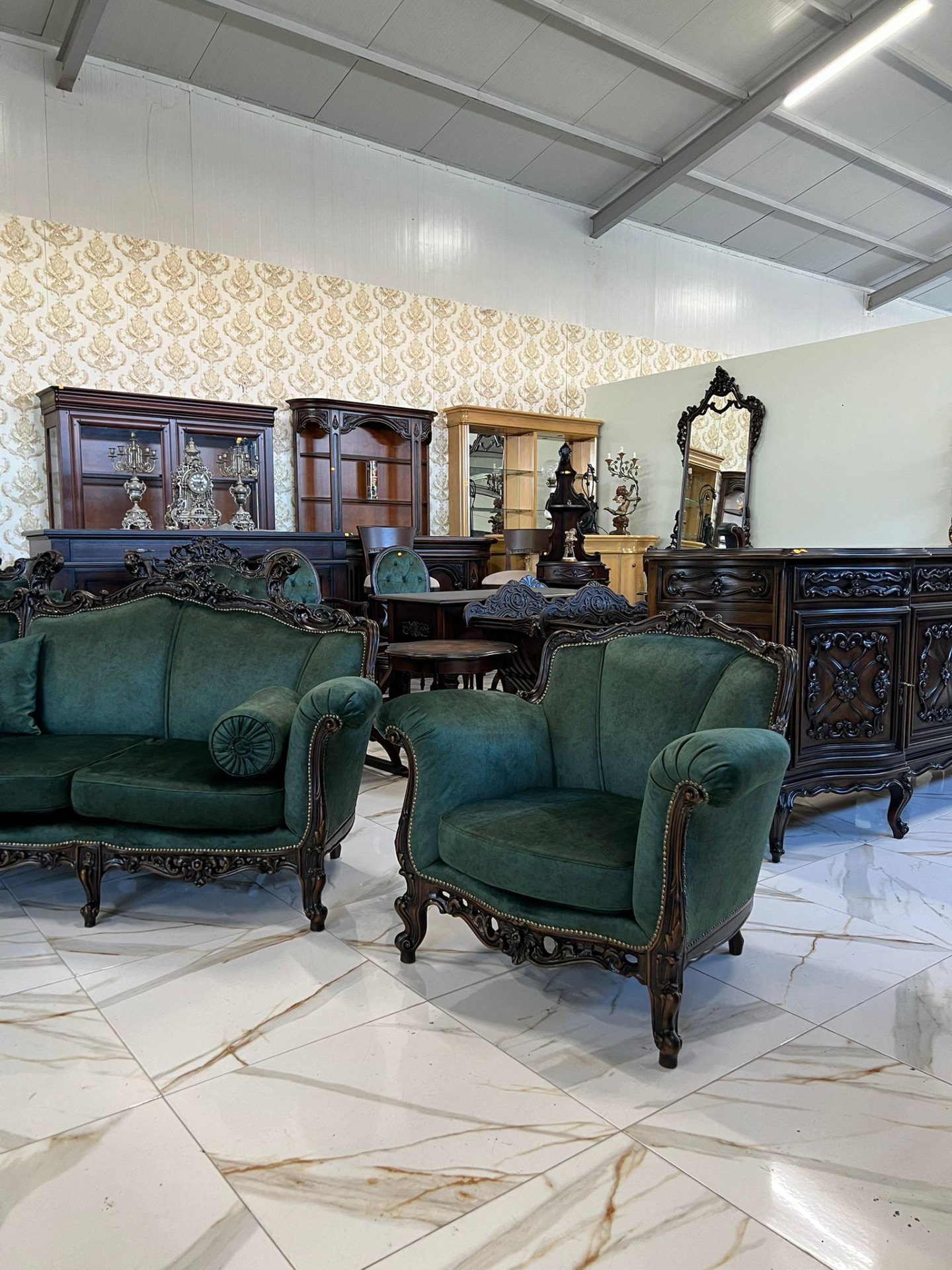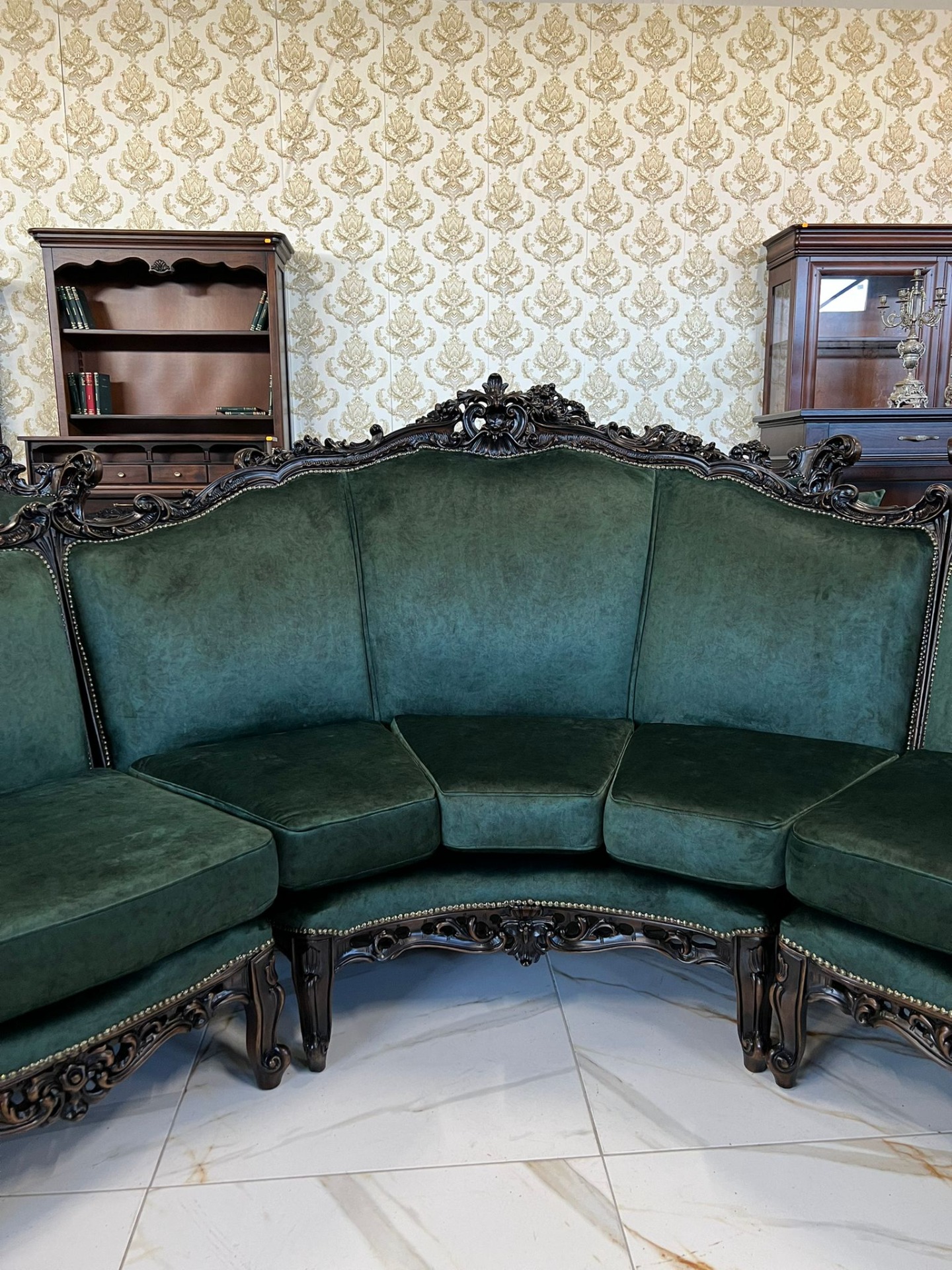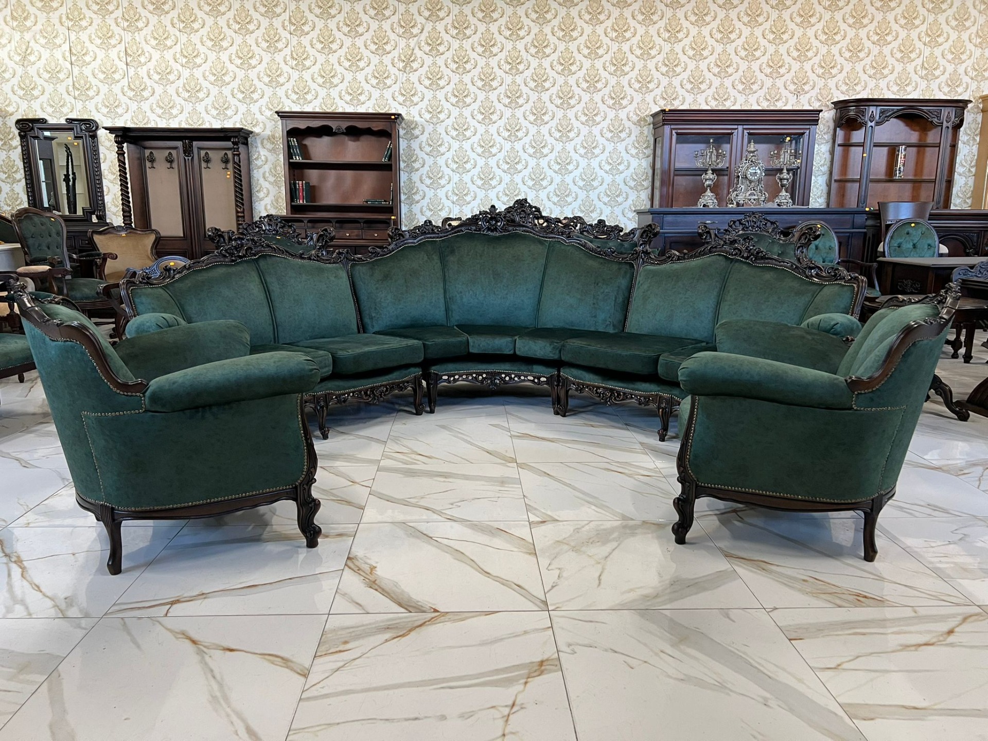 Minunat si unicat la noi acest set Baroc compus din canapeaua pe rotund de dimensiuni mari plus 2 fotolii complet restaurate in stare impecabilă!