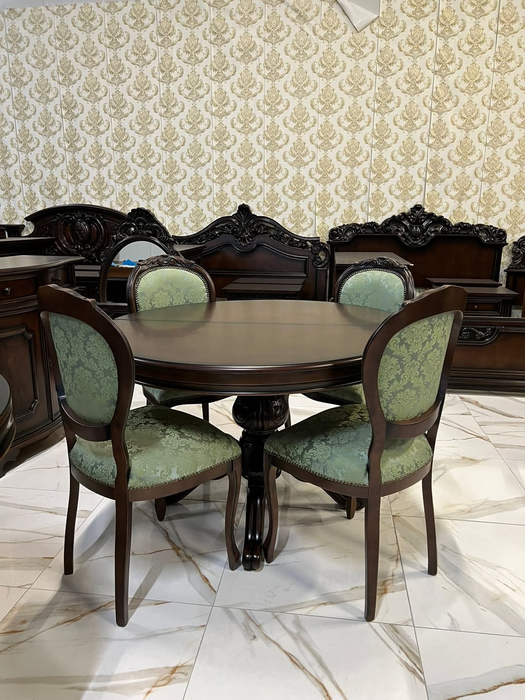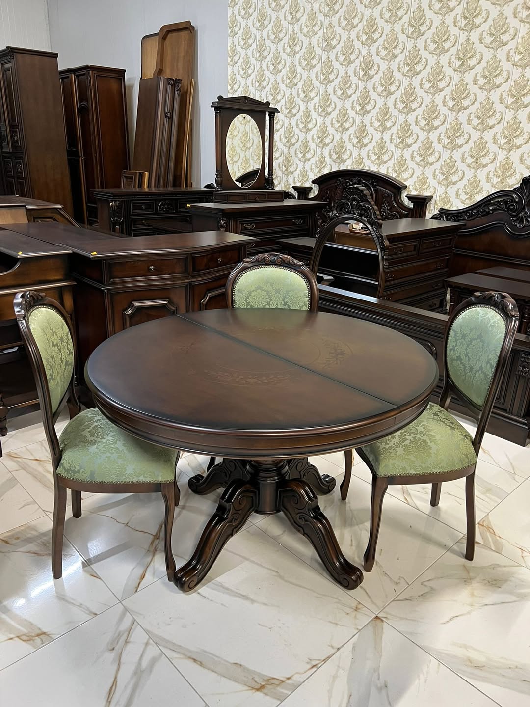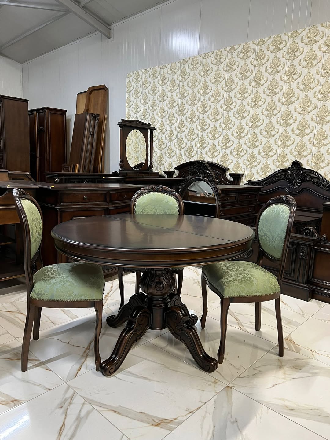 Masa rotunda extensibila cu intarsie florala complet restaurat si set 4 scaune!