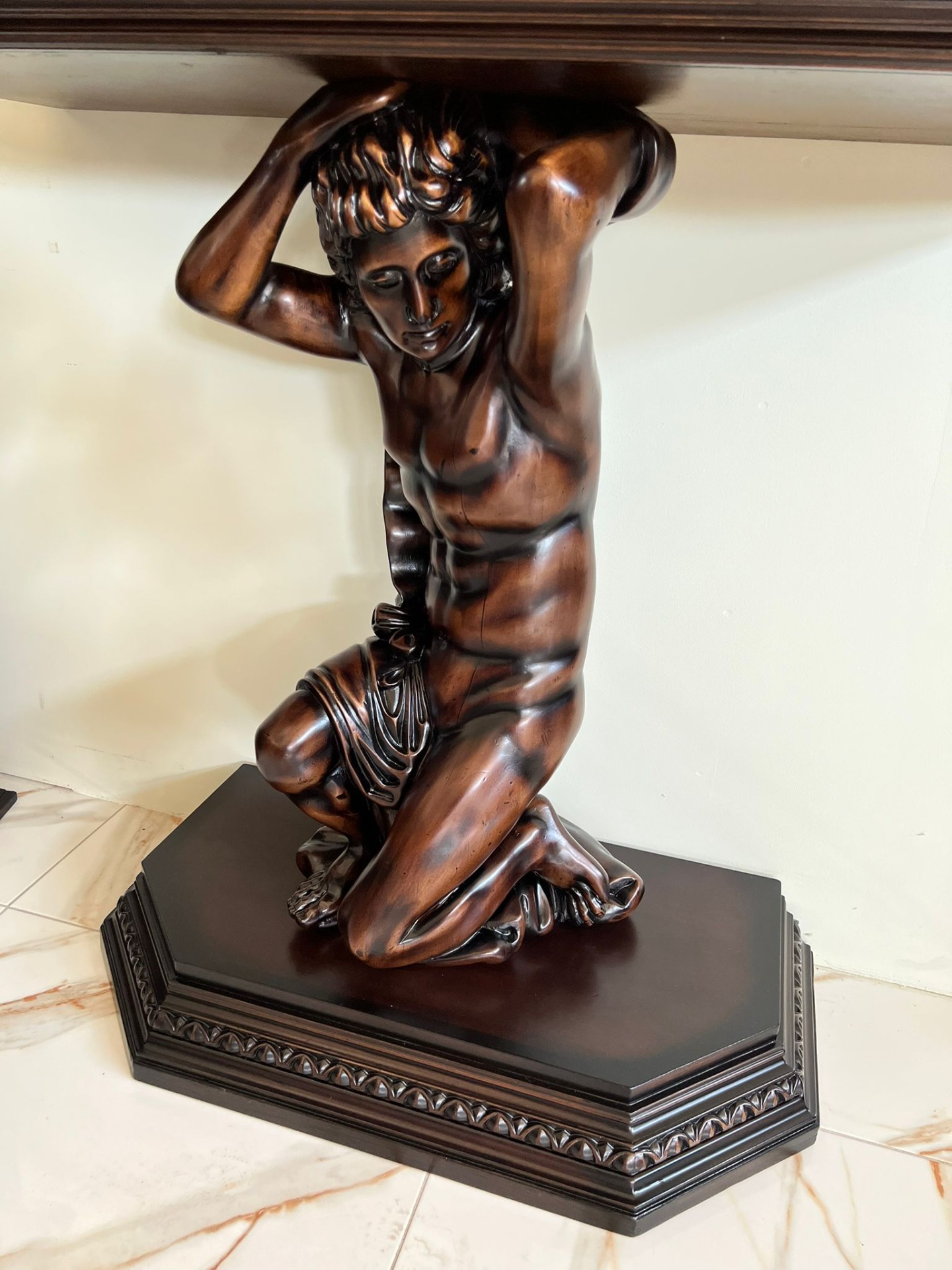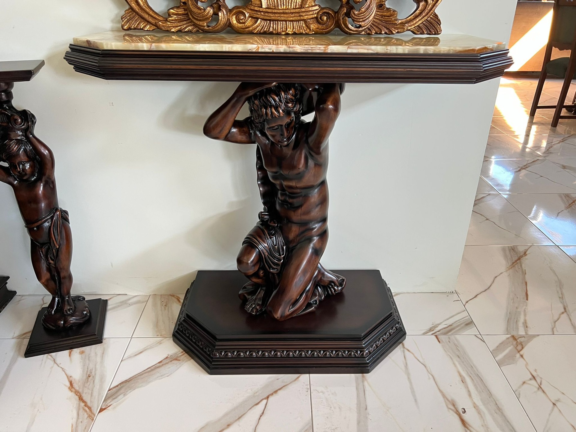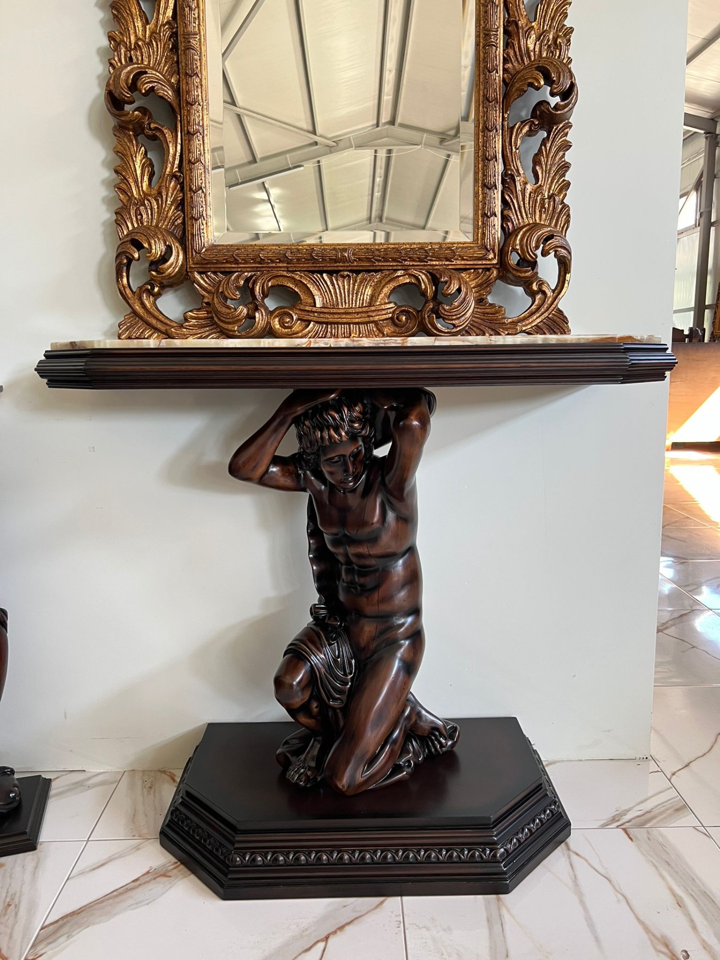 Set hol întrare compus din consola cu statueta din lemn masiv, blatul din onix si oglinda din lemn cu finisaj antichizat cu foita de aur si sticla de cristal!