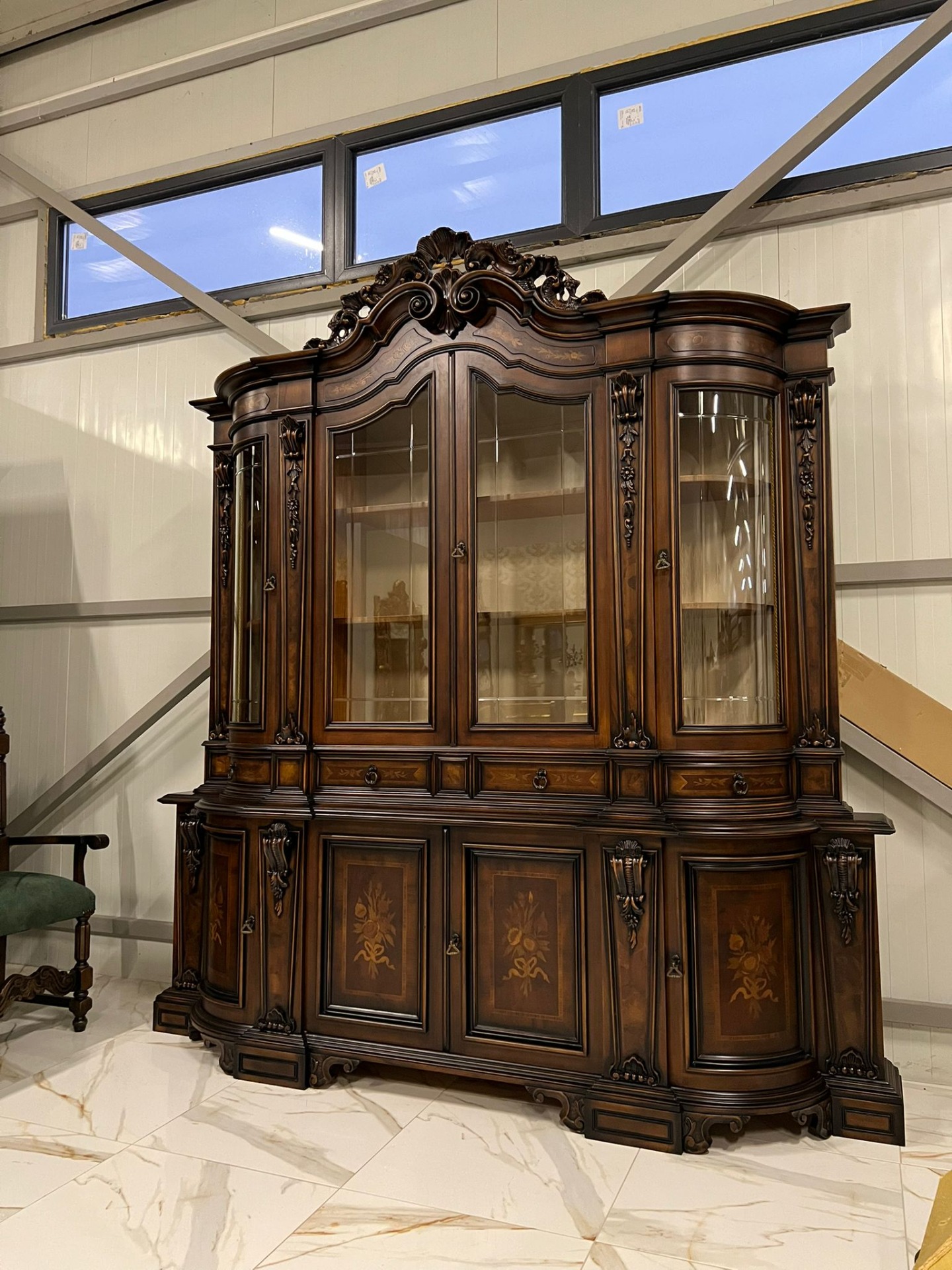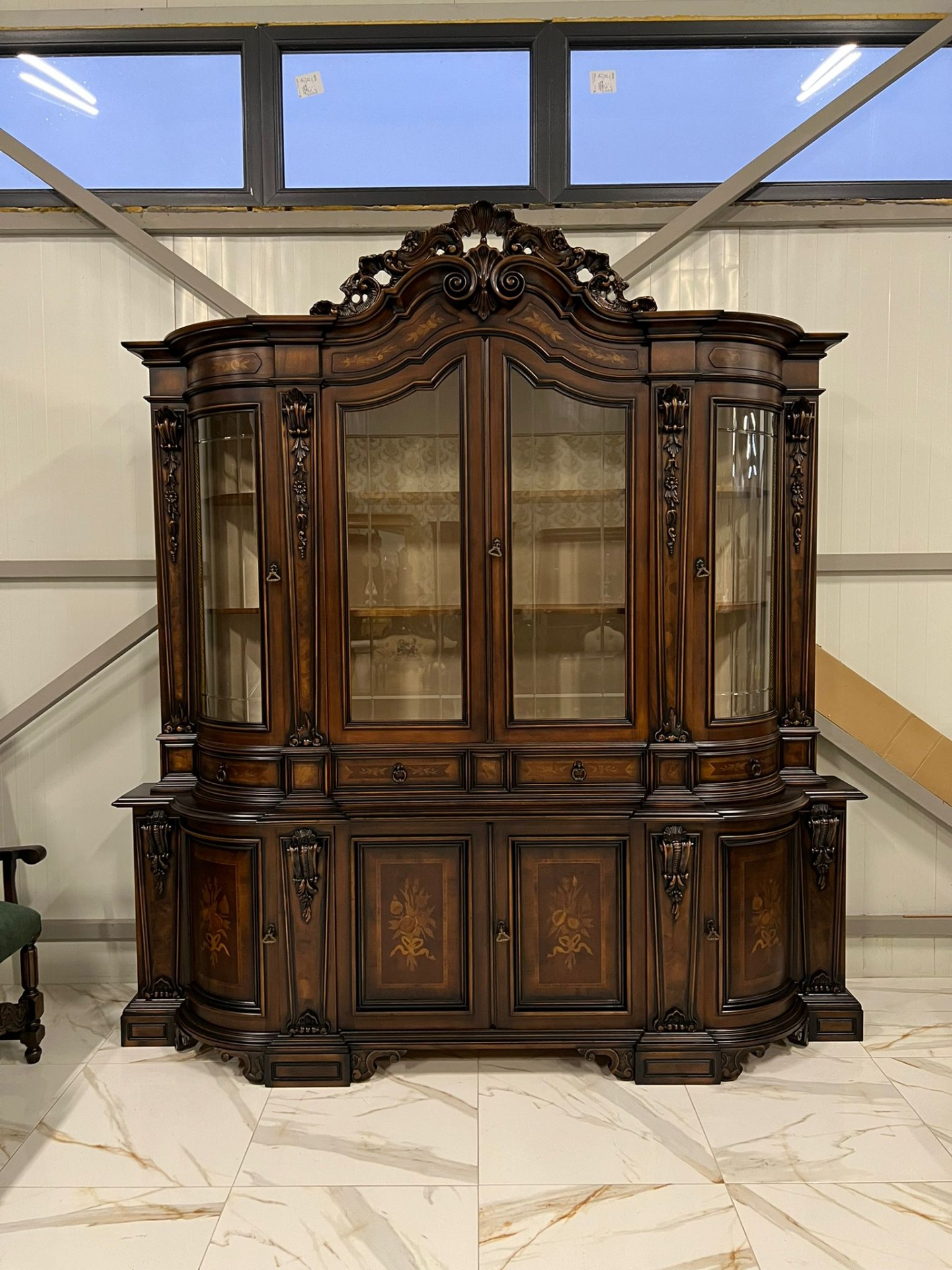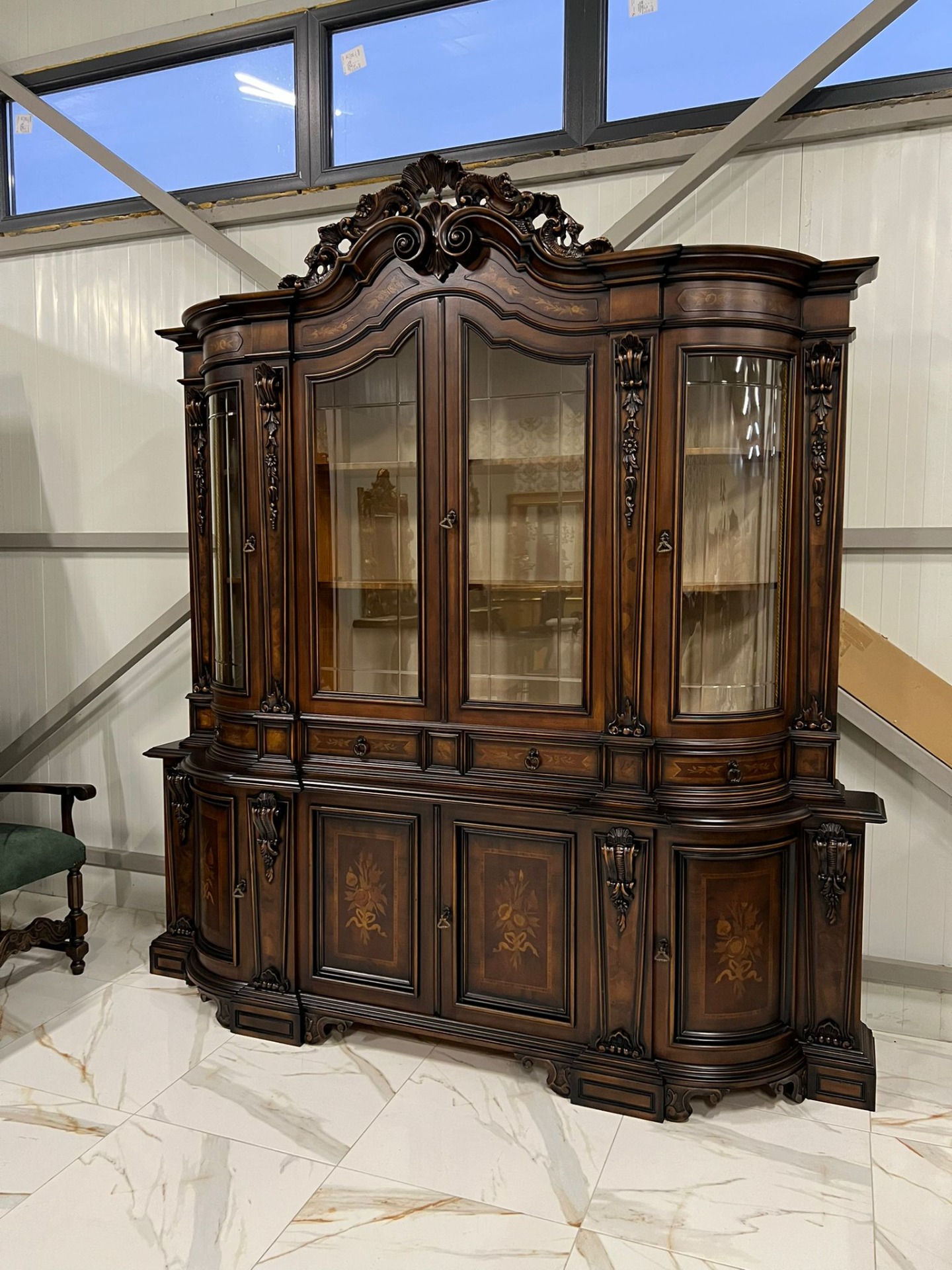Vitrina stil Baroc cu intarsie florala geam de cristal complet restaurata in stare impecabilă!➡️Dimensiuni 240 cm lungime, 45 cm adâncime, 254 cm înălțime sus la coroană!