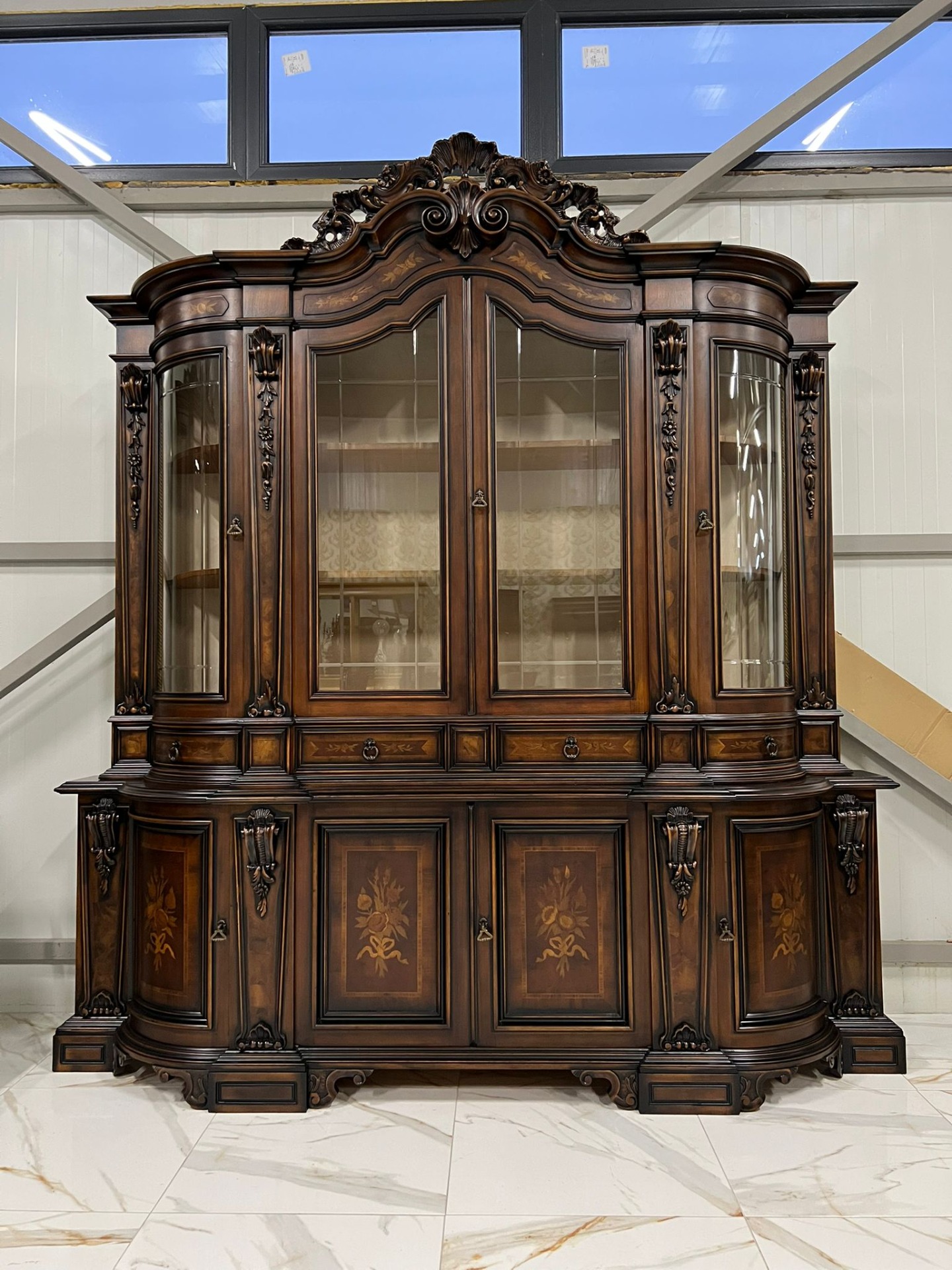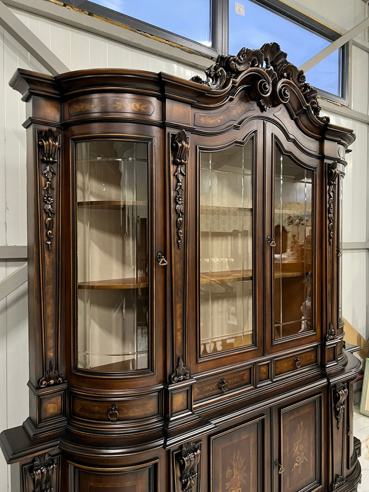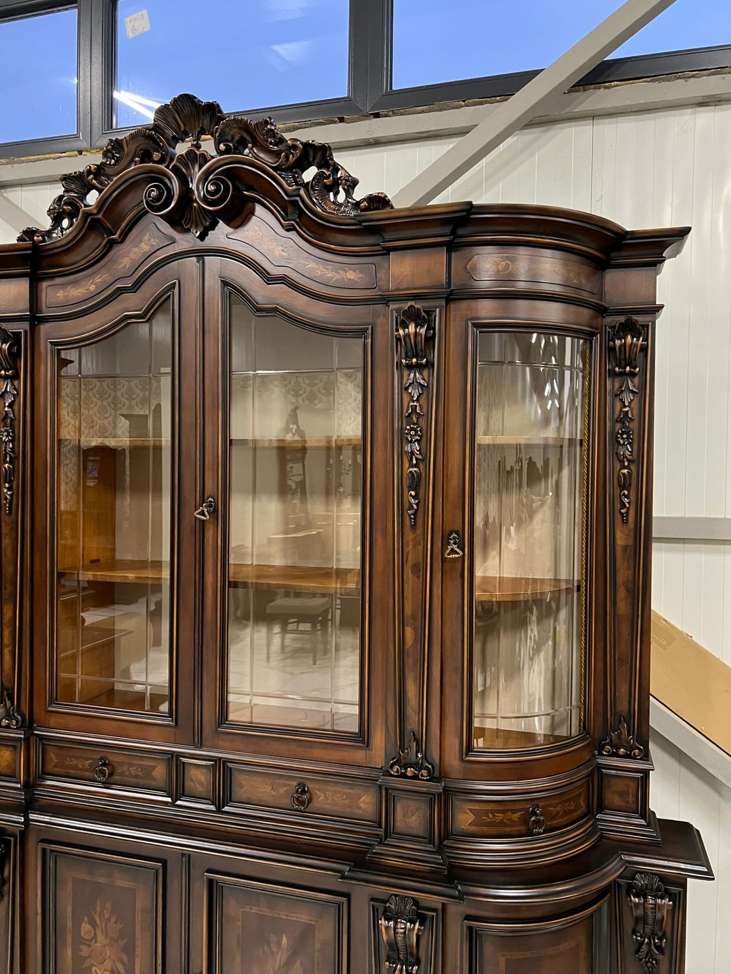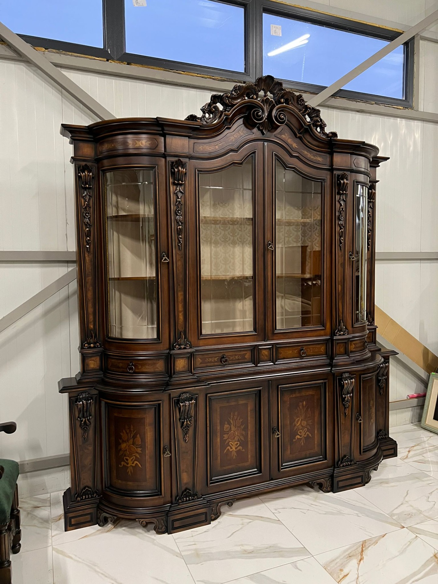 Vitrina stil Baroc cu intarsie florala geam de cristal complet restaurata in stare impecabilă!➡️Dimensiuni 240 cm lungime, 45 cm adâncime, 254 cm înălțime sus la coroană!